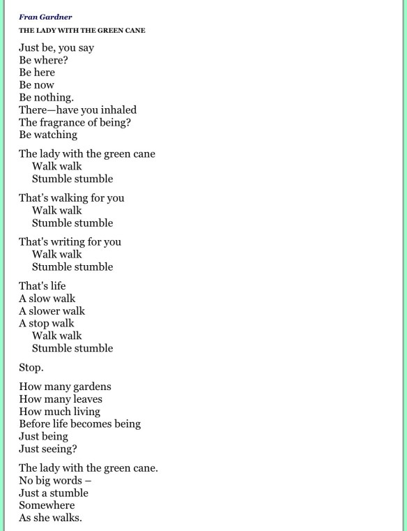 In this week’s writing class our teacher offered us a poem called The Green Cane by Fran Gardner. The poem is from an anthology called Wordgathering: A Journal of Disability Poetry and Literature. Ms Gardner is an award winning artist and professor emerita of art and art history at the University of South Carolina Lancaster. She paints and draws with traditional materials, but also with the sewing machine, layering her work with rich texture, color and mark-making. She writes critical essays about art, leads retreats, teaches workshops, and judges and curates exhibitions.
