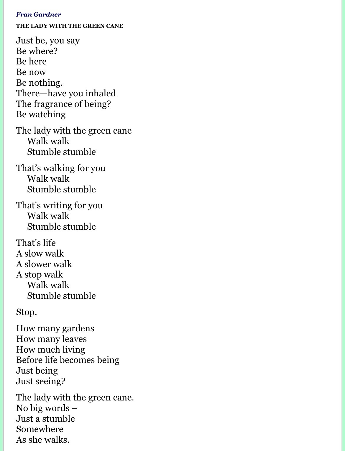 In this week’s writing class our teacher offered us a poem called The Green Cane by Fran Gardner. The poem is from an anthology called Wordgathering: A Journal of Disability Poetry and Literature. Ms Gardner is an award winning artist and professor emerita of art and art history at the University of South Carolina Lancaster. She paints and draws with traditional materials, but also with the sewing machine, layering her work with rich texture, color and mark-making. She writes critical essays about art, leads retreats, teaches workshops, and judges and curates exhibitions.
