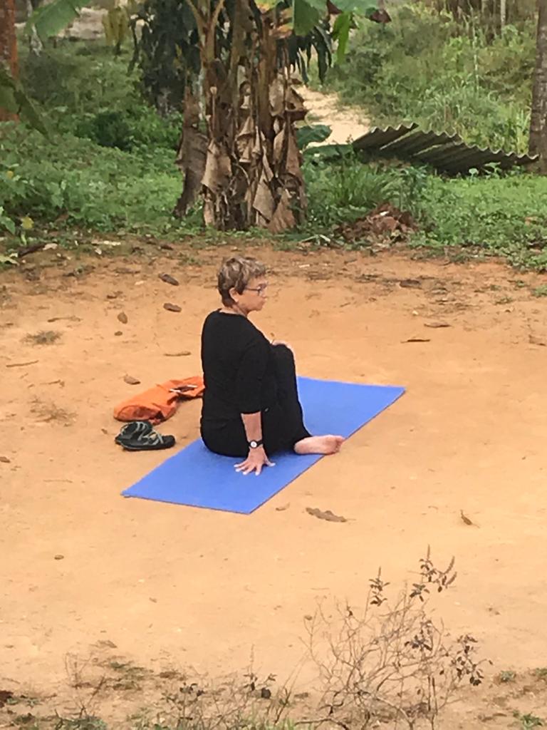 Below our second-floor balcony is a sandy yard with a hammock, some tree stump seats, and a raised cement platform where I do my daily yoga and meditation. Beyond the wood-slat fence, with its greenery, is a walkway of sand and spotty grass where solitary villagers or small groups of school children can be observed passing by from time to time.