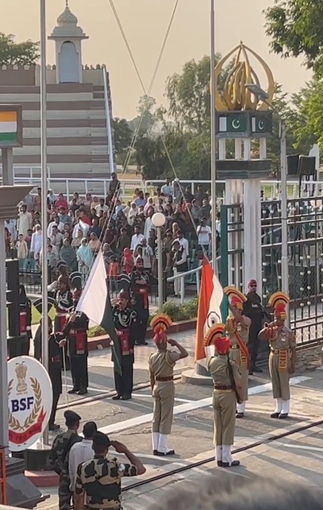 We’d been told to get there at 3 pm because the lines are long and the seating is first come first seated. Turns out this is for the winter when the ceremony is held at 4:15. In the sweltering summer heat the ceremony is at 5:15 and we could’ve saved ourselves an hour of broiling in the sun. In addition, there’s a separate line for VIPs (primarily army veterans) and foreigners. We ended up both befriended by a friendly Indian family, grown daughter, mother and army veteran father, who guided us along, and being the first in the VIP line.